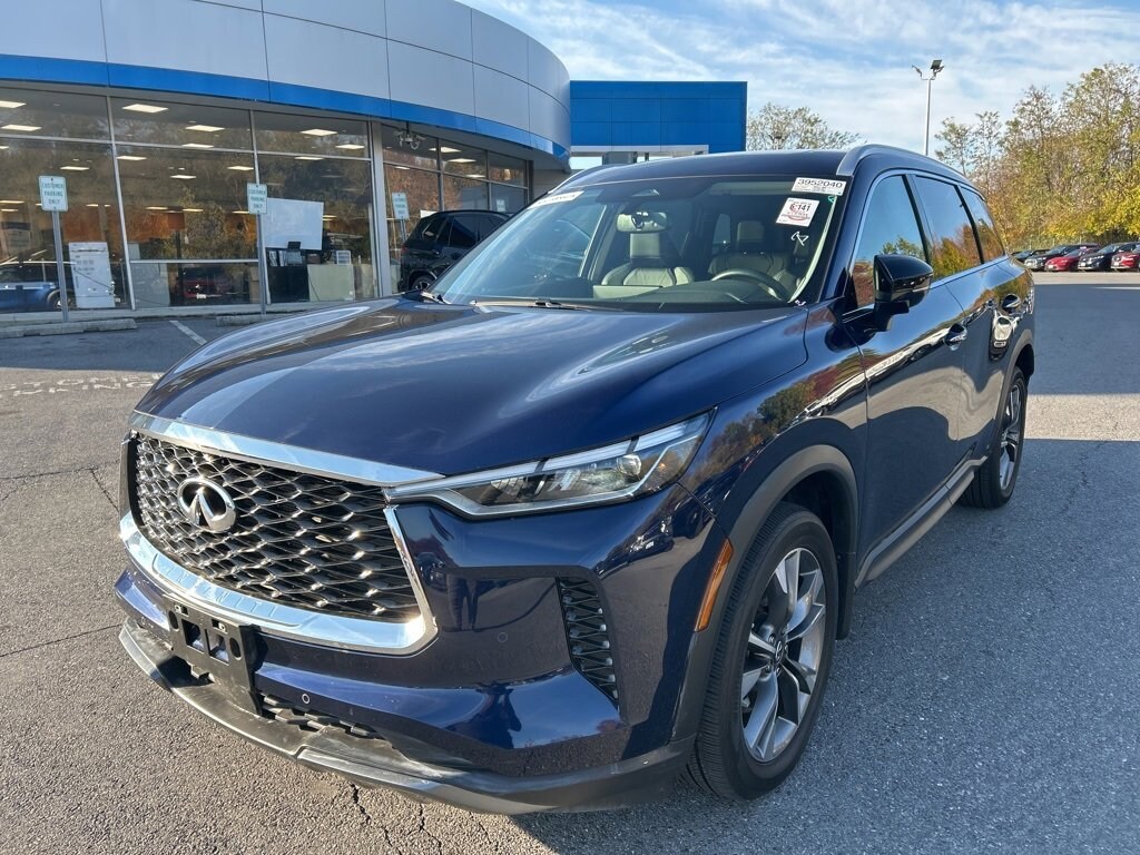 Used 2022 INFINITI QX60 Luxe AWDVIN: 5N1DL1FS6NC343890Odometer: 14831Exterior Color: Grand BlueInterior Color: GraphiteEngine: 3.5L V6, 295 HP, 270 lb-ft TorqueTransmission: 9-Speed AutomaticDrivetrain: All-Wheel Drive (AWD)Vehicle OverviewElevate your driving experience with this 2022 INFINITI QX60 Luxe AWD, combining luxurious interior comfort with advanced safety and innovative technology. Designed with the family in mind, this three-row SUV delivers performance, convenience, and peace of mind for every journey.Performance & Mechanical Features3.5L V6 Engine producing 295 HP and 270 lb-ft Torque9-Speed Automatic TransmissionINFINITI Intelligent All-Wheel Drive (AWD)Hill Start Assist20-Inch Aluminum-Alloy WheelsRoof Rails for added cargo versatilityInterior Comfort & ConveniencePremium Leather-Appointed Seating, Heated & Ventilated Front SeatsHeated 2nd-Row SeatsPanoramic Power MoonroofRear Door SunshadesIntelligent Key with Remote Engine StartPower Tilt & Telescopic Steering ColumnLeather-Wrapped Heated Steering Wheel12.3-Inch Dynamic Meter DisplayPower Rear LiftgateRear Under-Seat & In-Floor Storage CompartmentsTechnology & InfotainmentINFINITI InTouch 12.3-Inch Display with Navigation & MapCareINFINITI InTouch Services + Wi-Fi HotspotWireless Apple CarPlay & Android AutoBose Performance 17-Speaker Audio SystemWireless Charging PadInteractive Display with Navigation & Premium TrafficDriver Assistance & Safety FeaturesProPILOT Assist with Navi-link including Steering Assist & Intelligent Cruise ControlPredictive Forward Collision Warning & Forward Emergency Braking with Pedestrian DetectionLane Departure Prevention & Departure WarningBlind Spot Warning & InterventionRear Automatic Braking & Rear Cross Traffic AlertFront & Rear Parking SensorsHigh Beam AssistTraffic Sign RecognitionAround View Monitor with Moving Object DetectionAdditional Features & PackagesCargo Package: Console Net, Trash Bin, Storage Divider, Reversible Cargo Mat, Cargo Net, Cargo Blocks, First Aid Kit, Rear Bumper ProtectorSplash GuardsCarpeted Floor Mats (Complimentary)Premium PaintManufacturers Suggested Retail Price: $55,900Options & Packages Total: $3,605Destination Charges: $1,195Total Price: $59,505Fuel Economy22 MPG Combined (20 City / 25 Highway)Estimated Annual Fuel Cost: $2,000Warranty Coverage4-Year / 60,000-Mile Basic Limited Warranty6-Year / 70,000-Mile Powertrain Limited Warranty7-Year / Unlimited Mileage Corrosion Warranty24-Hour Roadside Assistance & Complimentary Service LoanThis 2022 INFINITI QX60 Luxe AWD blends luxury, performance, and cutting-edge safety in a versatile SUV perfect for family adventures or daily commuting.Used & Certified vehicle Prices do not include tax, tags, title, registration, electronic filing fee, processing fee of $800 (Not required by law), and iKon (Optional $1,295.)